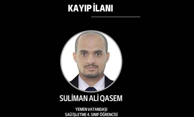وقال الاتحاد في بيان صحفي على حسابه بمنصة فيسبوك، "إن الطالب سليمان علي محمد علي قاسم، طالب في جامعة سكاريا، قسم إدارة الأعمال، سنة رابعة مفقود منذ يوم الاثنين الماضي حيث رصدت كاميرات المراقبة الطالب وهو عائد إلى منزله الكائن في شارع الجامعة".