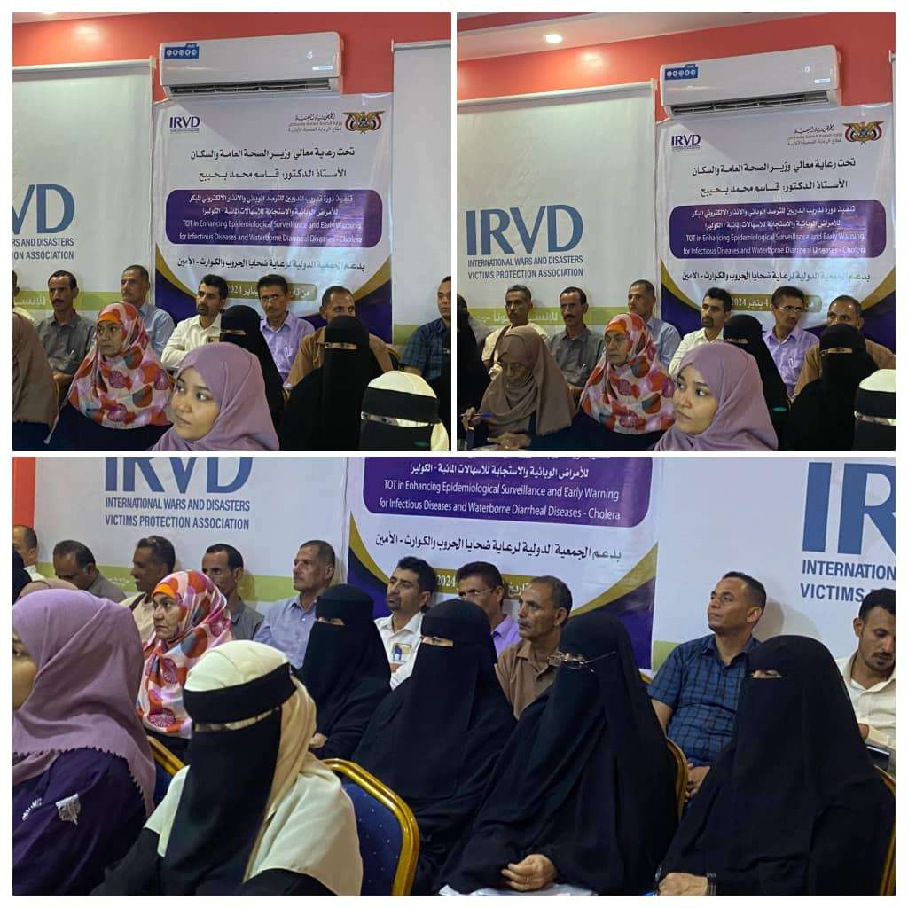الدورة التي ينظمها الادارة العامة لمكافحة الأمراض والترصد الوبائي بقطاع الرعاية الصحية الأولية بدعم من الجمعية الدولية لرعاية ضحايا الحروب والكوارث الامين يشارك فيها 42 متدربا من فرق الاستجابة السريعة والاديوز بمحافظات عدن وحضرموت الساحل وتعز وشبوة والمهره ومأرب سيتلقون فيها وعلى مدى ثلاثة أيام عدد من المعارف والمهارات منها مقدمة عن الترصد وأهدافه وادواره وأهميته والتعريف القياسي المحدث للاسهالات المائية الحادة واشتباه الكوليرا واعطاء فكرة عامه عنها وتصنيف الحالة بحسب الدليل المحدث من وزارة الصحة..