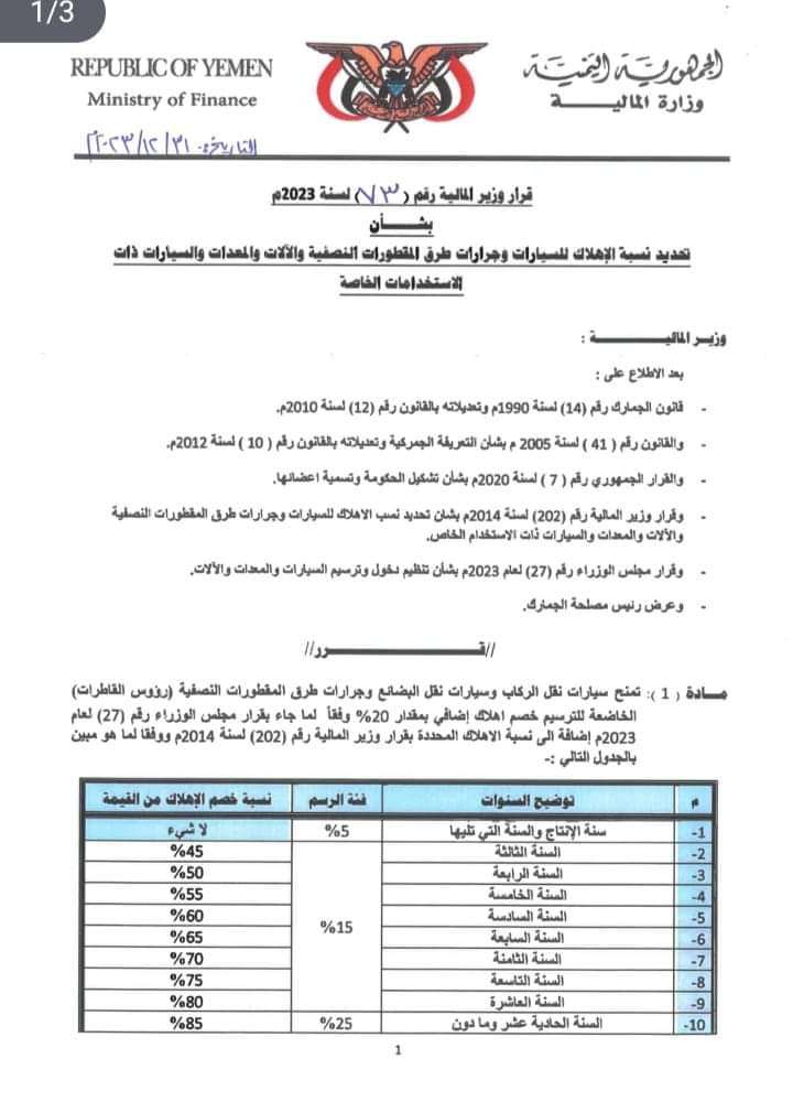وبحسب وثيقة صادر عن الوزارة بقرار رقم 73 لعام 2023م، فإن القرار يشمل جميع الموديلات، ويبدأ العمل به اعتباراً من 1 يناير 2024م.