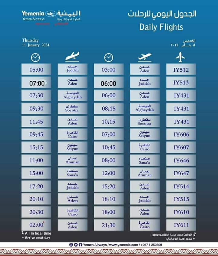 حفظ الصورة مواعيد رحلات طيران اليمنية ليوم غد الخميس 11 يناير 2024 الأربعاء ١٠ يناير ٢٠٢٤ الساعة ٠٦:٢٧ مساءً عدن/ مجال نت