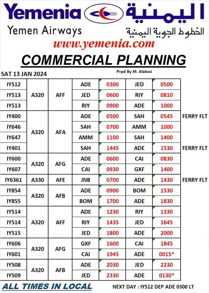 حفظ الصورة مواعيد رحلات طيران اليمنية ليوم غد السبت 13 يناير 2024 الجمعة ١٢ يناير ٢٠٢٤ الساعة ٠٩:٤٦ مساءً عدن/ مجال نت