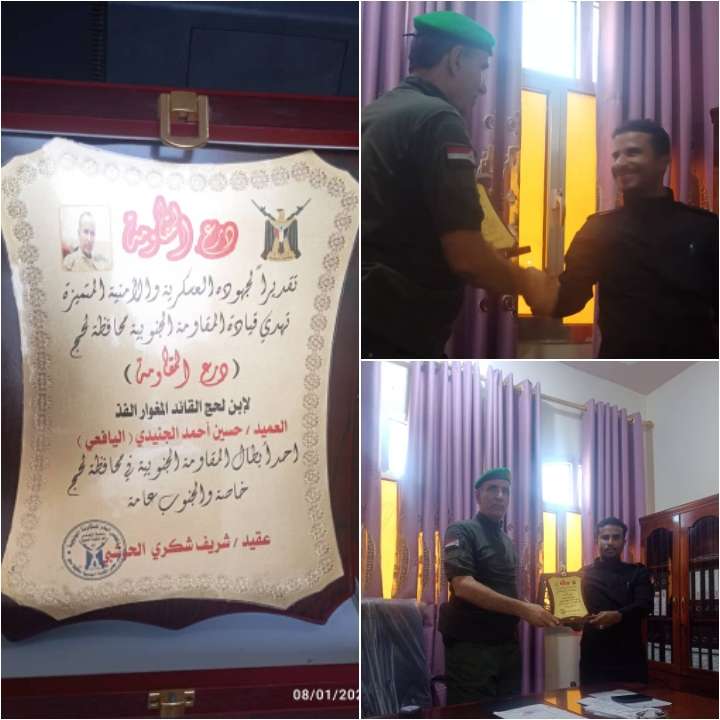 كرم رئيس مجلس المقاومة الجنوبية بمحافظة لحج العقيد شريف شكري الحوشبي صباح اليوم الأحد بدرع المقاومة الجنوبية التذكاري، مدير عام أمن وشرطة المحافظة العميد حسين الجنيدي، عرفاناً لجهوده في تعزيز حالة الأمن والاستقرار بالمحافظة خلال فترة عمله.