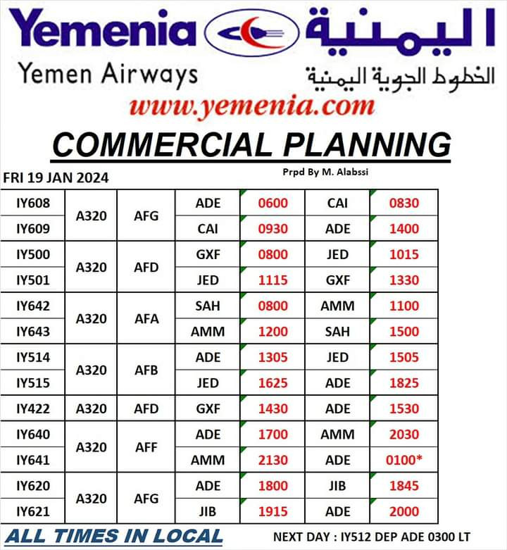 حفظ الصورة مواعيد رحلات طيران اليمنية ليوم غد الجمعة 19 يناير 2024 الخميس ١٨ يناير ٢٠٢٤ الساعة ٠٨:٢٣ مساءً عدن/ مجال نت