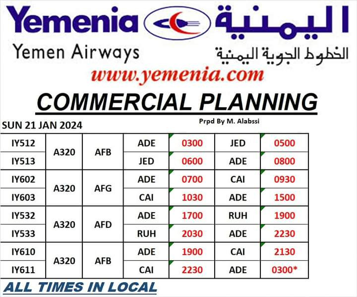حفظ الصورة مواعيد رحلات طيران اليمنية ليوم غد الأحد 21 يناير 2024 السبت ٢٠ يناير ٢٠٢٤ الساعة ٠٧:٤٠ مساءً عدن/ مجال نت