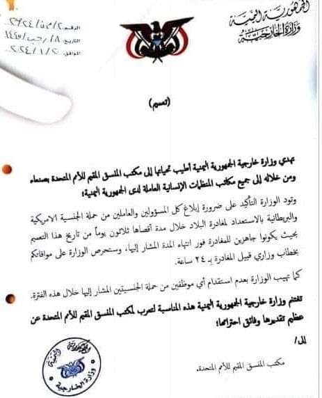 طالبت جماعة الحوثيين المنظمات الأممية والدولية في اليمن، مغادرة موظفيها الأمريكيين والبريطانيين خلال شهر.