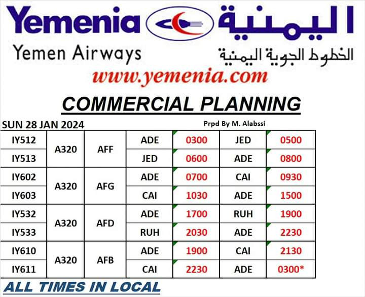 حفظ الصورة مواعيد رحلات طيران اليمنية ليوم غد الأحد 28 يناير 2024 السبت ٢٧ يناير ٢٠٢٤ الساعة ١٠:٠٤ مساءً عدن/ مجال نت