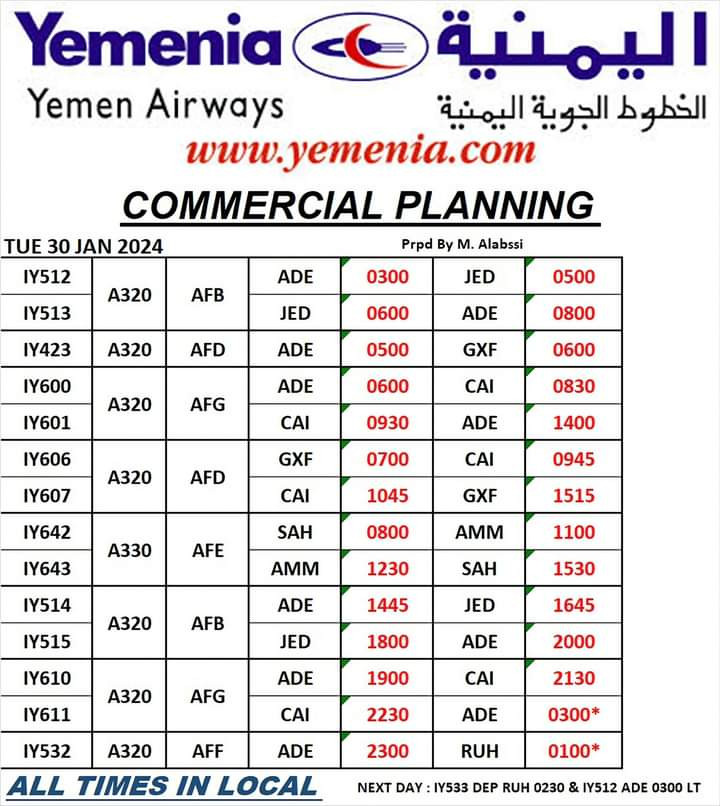 حفظ الصورة مواعيد رحلات طيران اليمنية ليوم غد الثلاثاء 30 يناير 2024 الإثنين ٢٩ يناير ٢٠٢٤ الساعة ٠٥:٣٧ مساءً عدن/ مجال نت