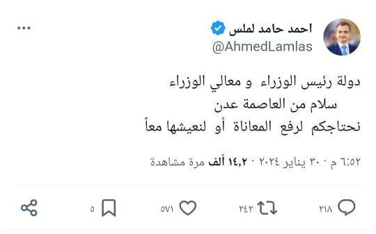 دعوة المحافظ لملس، جاءت في منشور له بمنصة "إكس" والتي قال فيها : "محافظ عدن أحمد لملس