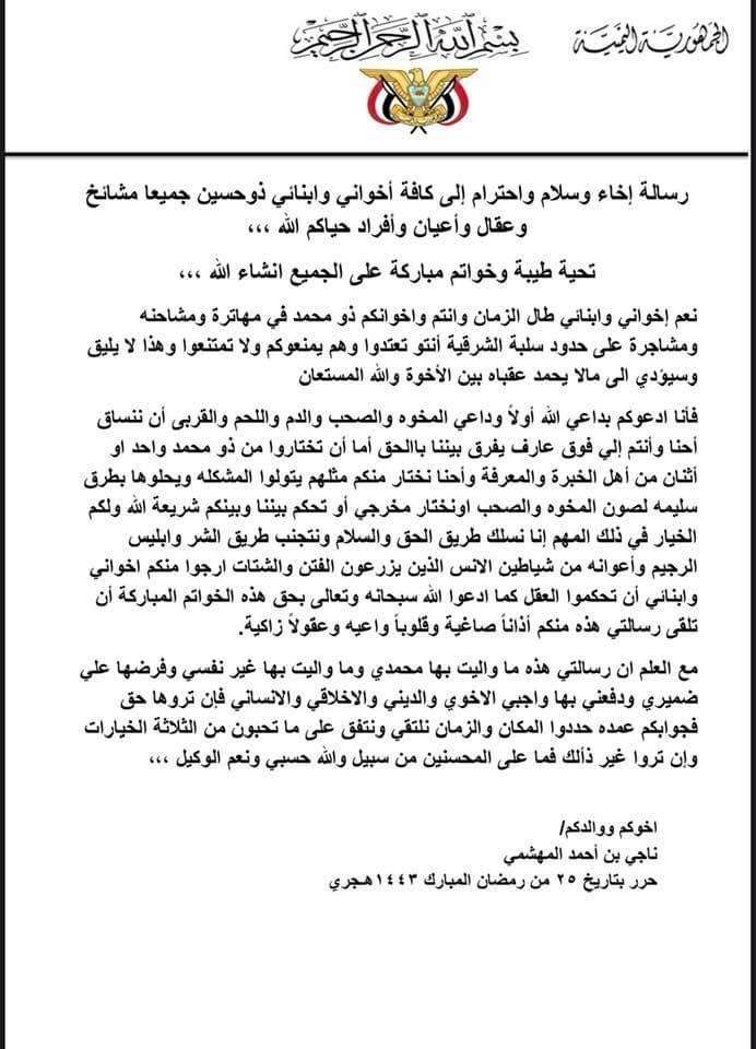 ووجه الشيخ ناجي بن أحمد رسالة لمشايخ وعقلاء قبيلة ذو محمد وحسين لوقف الخلافات والانحياز عن الفتنة وتجيب أي يصار قد يخلف في صفوف الطرفين ضحايا.