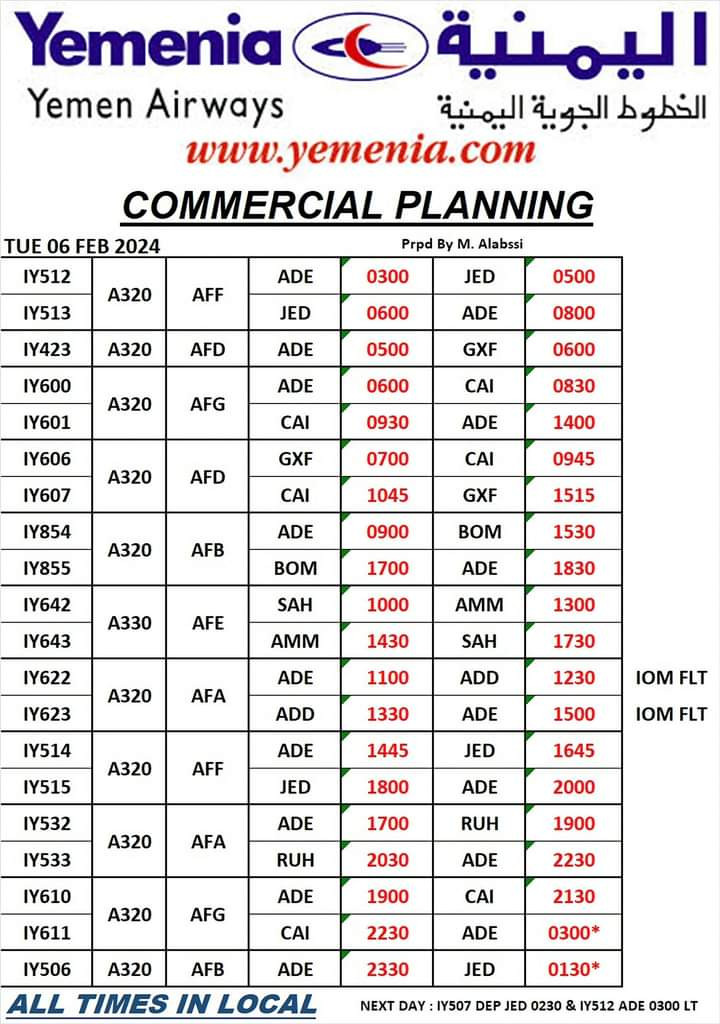 حفظ الصورة مواعيد رحلات طيران اليمنية ليوم غد الثلاثاء 6 فبراير 2024 الإثنين ٠٥ فبراير ٢٠٢٤ الساعة ٠٦:٠١ مساءً عدن/ مجال نت