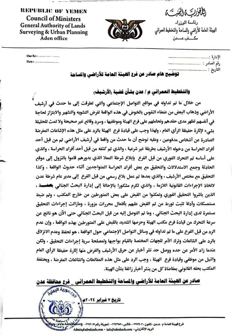 من خلال ما تم تداوله في مواقع التواصل الإجتماعي والتي تطرقت إلى ما حدث في أرشيف الأراضي وذهاب البعض من ضعفاء النفوس بالخوض في هذه الواقعة لغرض التشويه والتشهير والابتزاز لحاجة في أنفسهم تظهر مدى حقدهم وتحاملهم على فرع الهيئة وموظفيها ، وسرد وقائع غير صحيحة ولا تمت للحقيقة بشيء لإثارة حفيظة الرأي العام ، ولهذا وجب على قيادة فرع الهيئة بالرد على مثل هذه الإشاعات المغرضة الصادرة عن أشخاص مدفوعين ، وعليه نوضح أن ما حدث من واقعة في أرشيف الأراضي تم من قبل أحد أفراد الحراسة من دخوله الأرشيف بطريقة غير شرعية ، والذي تم كشفه من قبل أحد أفراد الحراسة ، والذي على أساسه تم التحرك الفوري من قبل الفرع بإبلاغ شرطة المعلا الذي بدورهم قاموا بالنزول إلى موقع الحادثة وجمع الاستدلالات والتحقيق مع بعض أفراد الحراسة المتواجدين أثناء حدوث الواقعة ، وكذا التحقيق مع مختص الأرشيف ، والذي بعدها تم عمل بلاغ رسمي من قبل الفرع إلى مدير عام شرطة عدن لاتخاذ الإجراءات القانونية اللازمة ، والذي تكرم مشكورا بالإحالة إلى إدارة البحث الجنائي بالعاصمة ، الذين باشروا التحقيق الفوري وتمكنوا من القبض على بعض المتورطين من خارج المكتب ، وتم ضبط مستمسكات وأدلة تثبت تورط من تم القبض عليهم بأفتعال محررات مزورة ، ومازالت إجراءات التحقيق مستمرة لدى إدارة البحث الجنائي ، وما تم التوصل إليه من قبل البحث الجنائي حتى الآن هو ناتج عن سرعة التحرك من قيادة فرع مكتب الهيئة وحرصها الشديد بالقبض على المتورطين بهذه الواقعة ، وإن عدم الرد من قبل الفرع على ما تم تداوله في وسائل التواصل الإجتماعي حول الواقعة ، هو تحفظ وعدم الانزلاق بالرد على الشائعات وترك الأمر للجهات المختصة بالقيام بواجبها ولمصلحة سرية إجراءات التحقيق ، ولكن عندما زاد الأمر عن حده ووصل حد نشر أخبار عن حرق الأرشيف والغرض منها إثارة حفيظة الرأي العام والنيل من موظفي وقيادة فرع الهيئة ، وجب الرد على مثل هذه المغالطات والشائعات المغرضة ، ويحتفظ المكتب بحقه القانوني بمقاضاة كل من ينشر أخبار زائفة بشأن الهيئة.