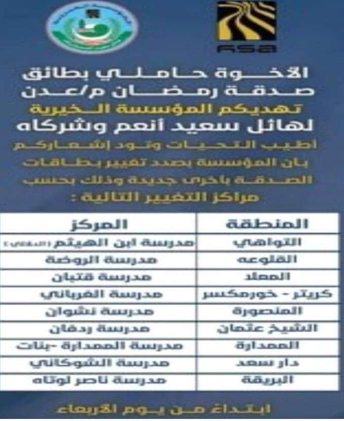 واشارت المجموعة الى فتح عدة مراكَز بمختلف مديريات عدن لاستبدال البطائق.
