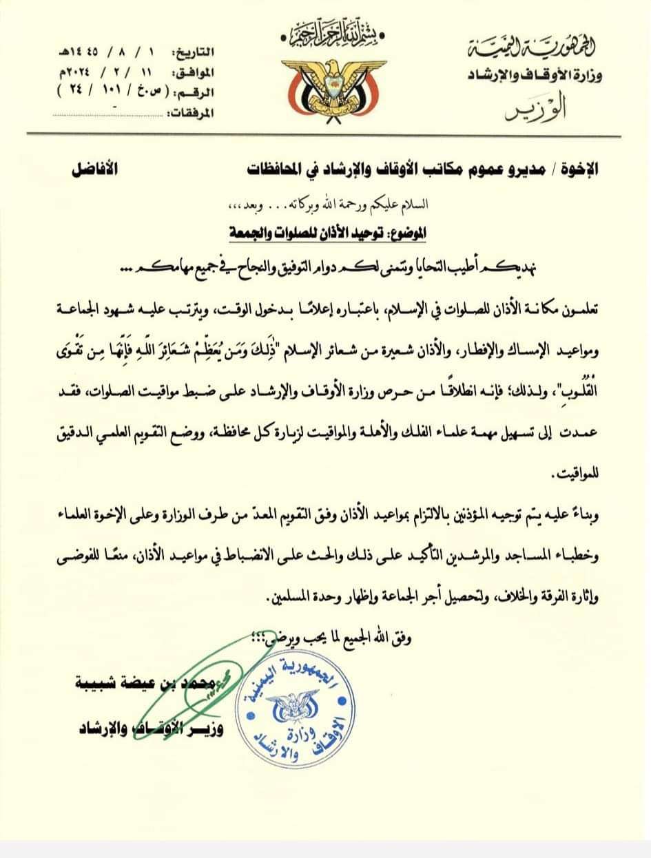 أصدرت وزارة الأوقاف والإرشاد، اليوم، بالعاصمة المؤقتة عدن، تعميمًا هامًا لمدراء عموم مكاتب الأوقاف بمحافظات الجمهورية، تضمن الالتزام بتوحيد الأذان للصلوات والجمعة كل محافظة حسب مواقيتها الفلكية وفقًا لنتائج الزيارات الميدانية للجان الأهلة والمقرة في تقويم وزارة الأوقاف والإرشاد.