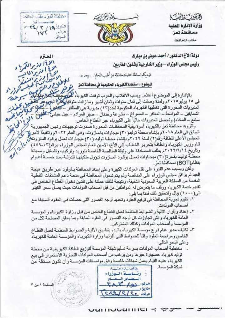 رئيس الوزراء يوجه بإجراءات تشغيل الكهرباء الحكومي لمحافظة تعز " وثيقة"