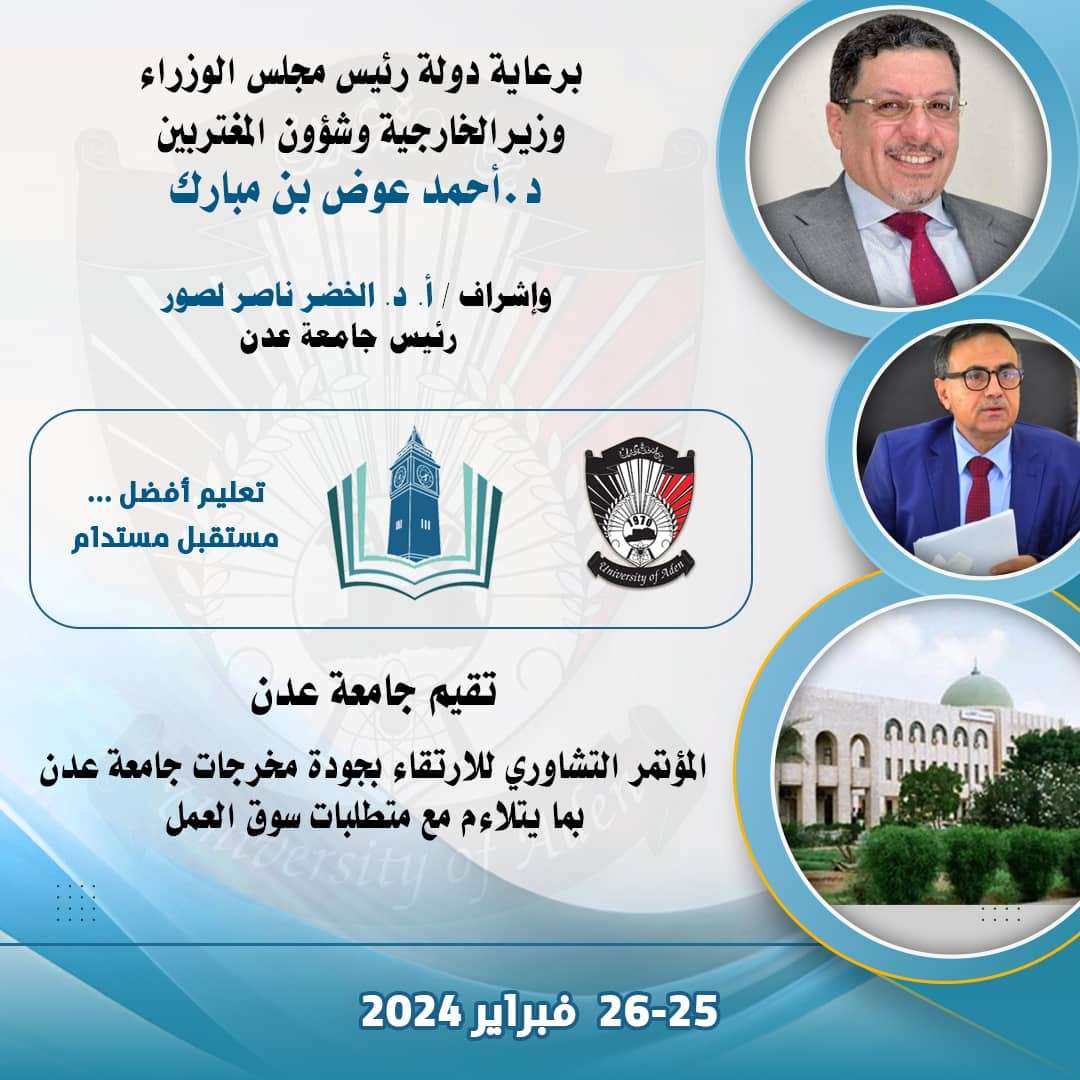 وسيشهد المؤتمر التشاوري حضور دولة رئيس مجلس الوزراء وزير الخارجية وشؤون المغتربين، الدكتور أحمد عوض بن مُبارك، ورئيس جامعة عدن الأستاذ الدكتور، الخضر ناصر لصور، ومشاركة أساتذة من جامعة فلورنسا الإيطالية، وعددًا من الأكاديميين والمسؤولين التعليميين والباحثين، وغيرهم من المهتمين بتحسن جودة مخرجات جامعة عدن.