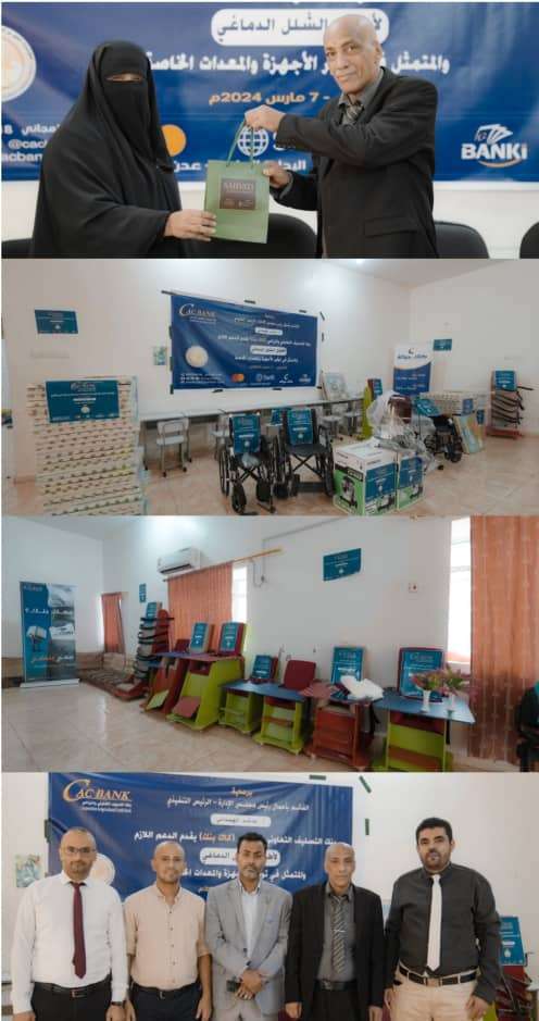 «كاك بنك» يسلم الأجهزة والمعدات الطبية التي وعد بها لمؤسسة الحق لأطفال الشلل الدماغي بعدن