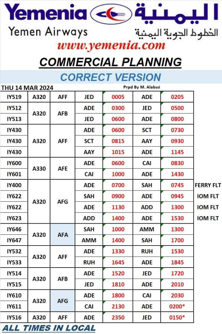 حفظ الصورة مواعيد رحلات طيران اليمنية ليوم غد الخميس 14 مارس 2024 الأربعاء ١٣ مارس ٢٠٢٤ الساعة ١٠:٢٠ مساءً عدن/ مجال نت
