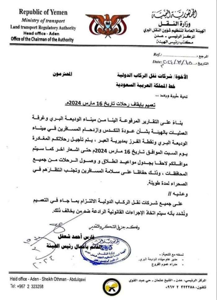 أعلنت الهيئة العامة لتنظيم شؤون النقل البري عن إيقاف الرحلات إلى السعودية عبر منفذ الوديعة الرابط بين اليمن والسعودية ابتداءً من اليوم السبت.