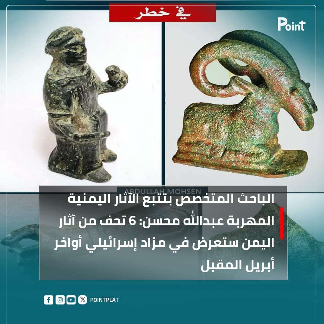كشف باحث آثاري يمني أن ست تحف أثرية يمنية ستباع في مزاد إسرائيلي في 25 ابريل/ نيسان المقبل، منتقدا سلبية الحكومة اليمنية في التعامل مع مثل هذا الموقف، لا سيما بعد أن تأكد أن هذه القطع الآثارية من (نزيف الحرب).