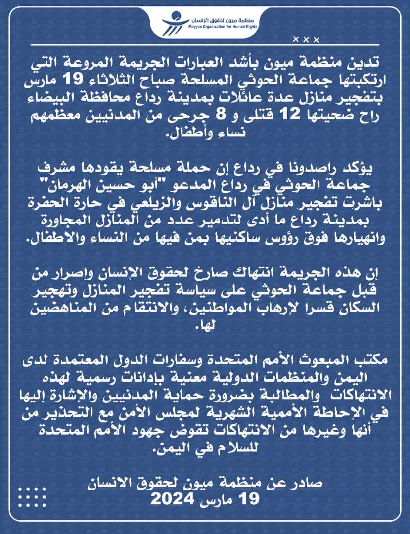 أدانت منظمة ميون لحقوق الإنسان بأشد العبارات الجريمة المروعة التي ارتكبتها مليشيات الحوثي المسلحة صباح الثلاثاء 19 مارس بتفجير منازل عدة عائلات بمدينة رداع محافظة البيضاء راح ضحيتها 12 قتيلا و8 مصابين من المدنيين معظمهم نساء وأطفال.