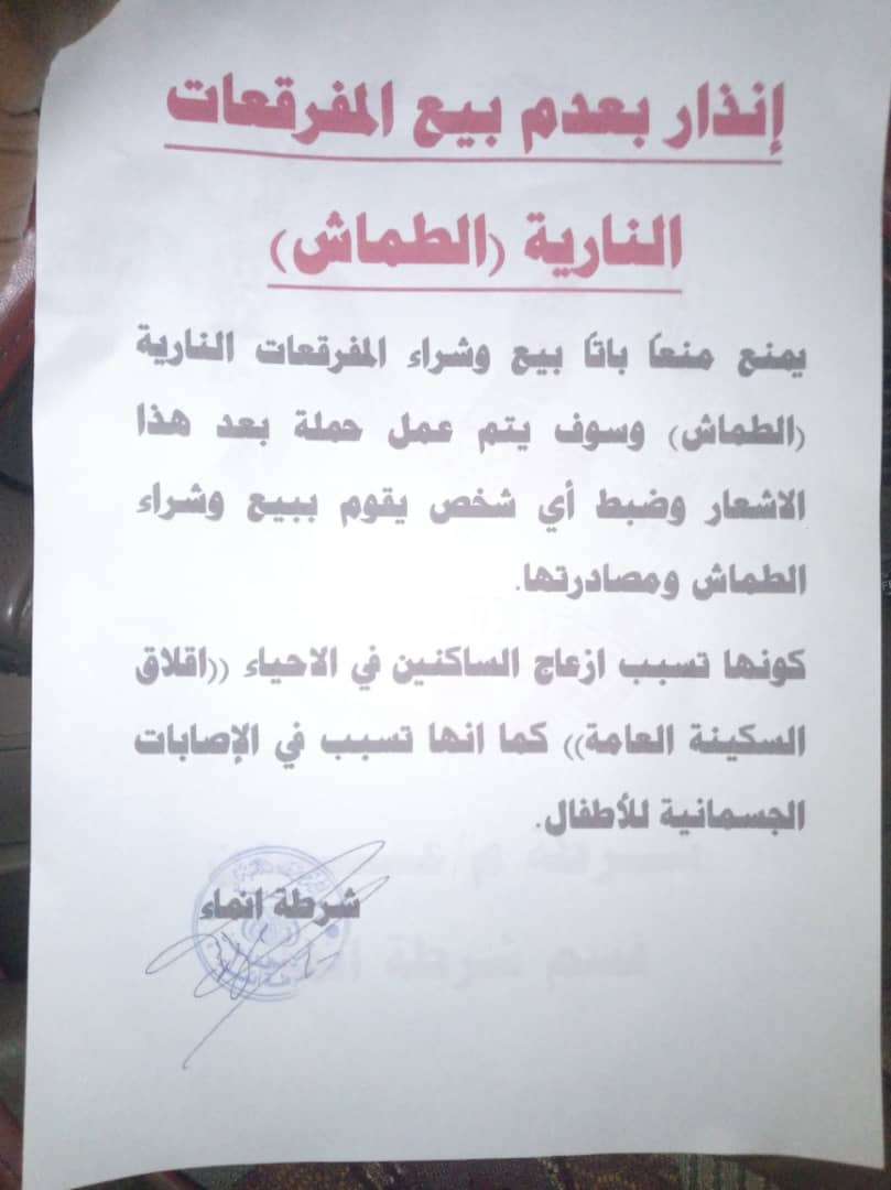 وجاء هذا التحذير عبر منشور تم توزيعة عبر أعضاء اللجان المجتمعية تنذر وتحذر فيه المواطنيين من بيع وشراء المفرقعات النارية الطماش، كونها تتسبب في ازعاج الساكنين في الاحياء واقلاق للسكينة العامة وأيضاً تتسبب في الاصابات الجسمانية للاطفال.