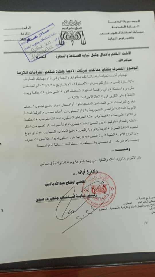 توجيهات القاضي باذيب شملت إلزام المستوردين المخالفين بإعادة تصدير الأدوية إلى بلد المنشأ أو إتلافها على نفقة المستورد الخاصة، وفي حالة اعتراض المستورد المخالف يتم تقديمه إلى محاكمة عاجلة.