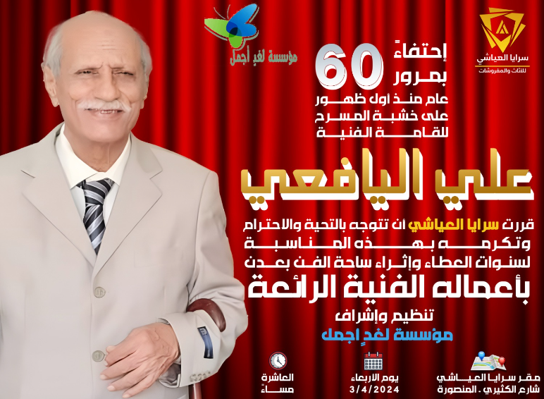 ويأتي تكريم الأستاذ علي اليافعي بمناسبة مرور 60 عامًا من العطاء وإثراء الفن بعدن بأعماله الفنية الرائعة التي أستمرت لفترة طويلة.