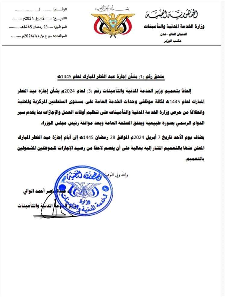 أعلنت وزارة الخدمة المدنية والتامينات في العاصمة المؤقتة عدن، عن تعديل موعد بدء إجازة عيد الفطر المبارك للعام الهجري 1445، لكافة موظفي وحدات الخدمة العامة على مستوى السلطتين المركزية والمحلية.