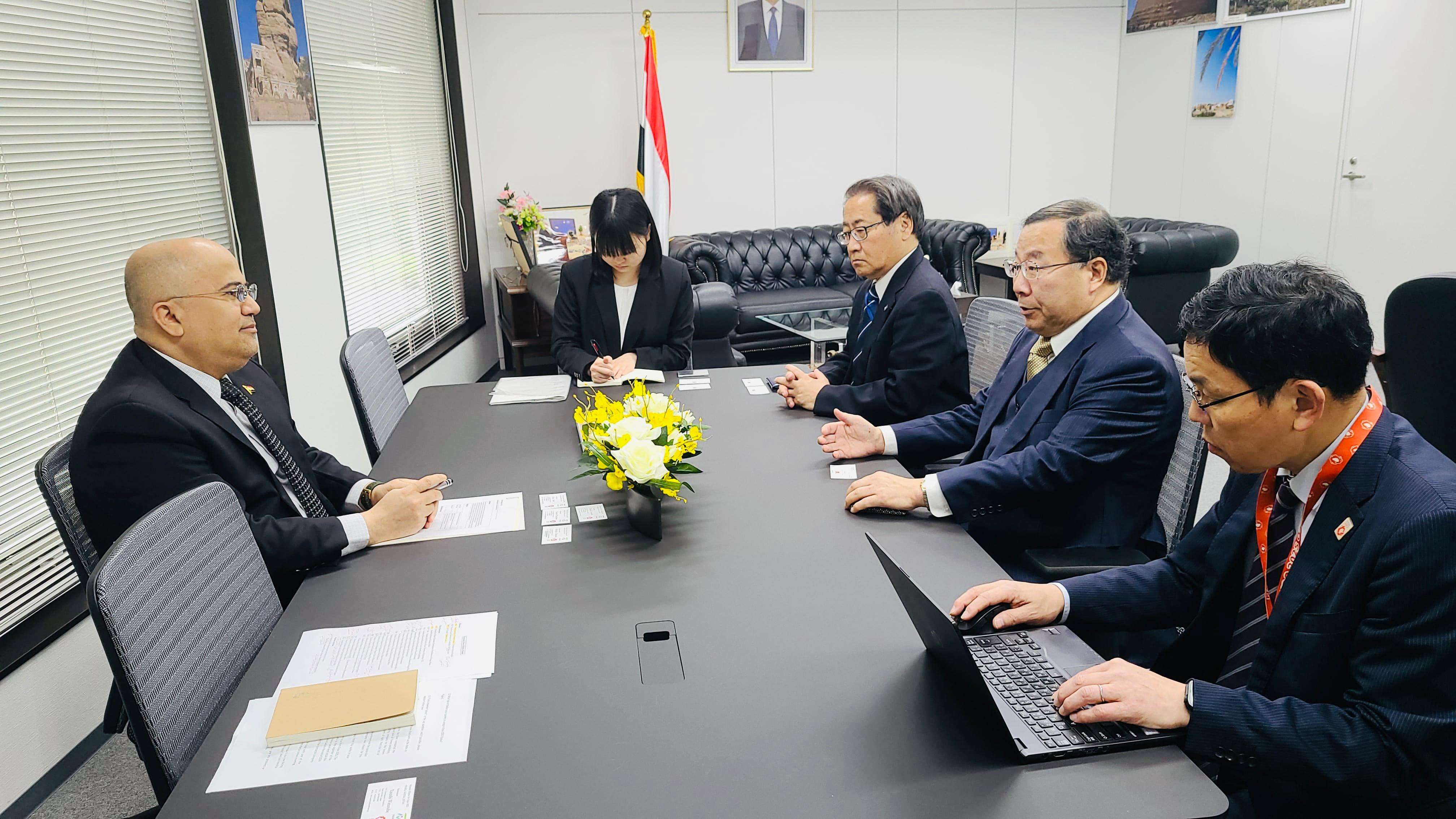 بحث سفير اليمن لدى اليابان عادل بن علي السنيني بمكتبه بمقر السفارة مع السفير هيدهيكو هامدا المستشار الخاص لاتحاد العمداء لشئون معرض اوساكا اكسبو, والمختصين في الاتحاد مشاركة اليمن فى معرض اكسبو اوساكا 2025