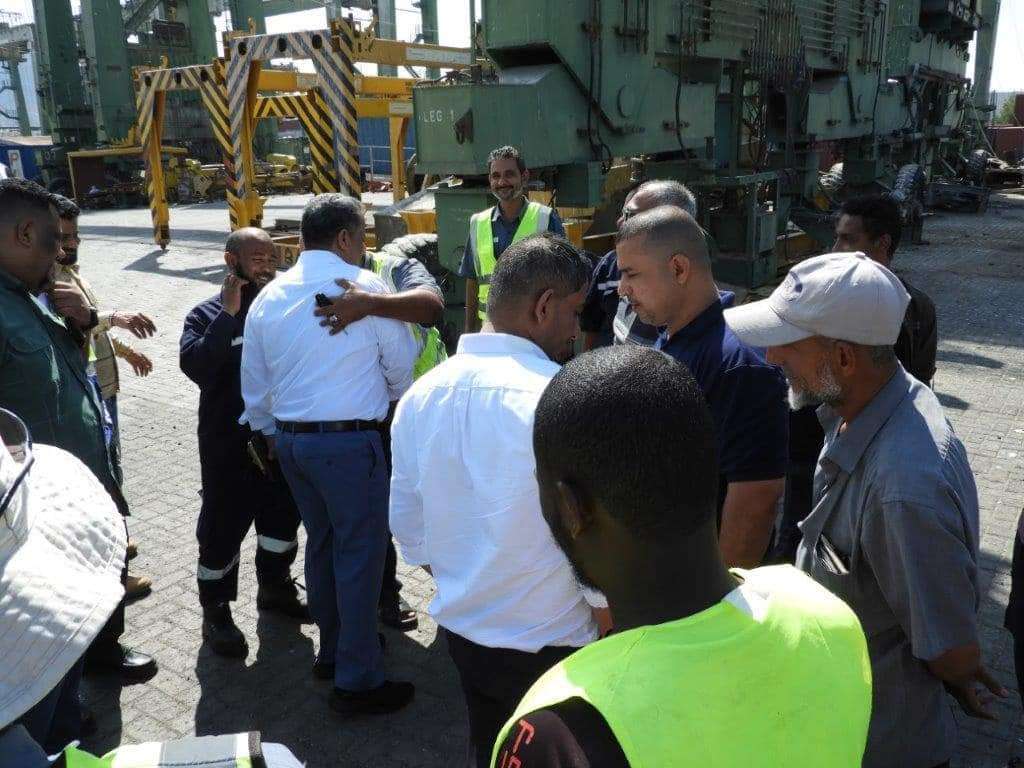 وطاف الدكتور محمد امزربه والأستاذ عارف الشعبي باقسام محطة الحاويات ومعايدة الموظفين وشكرهم على الجهود المبذولة في خدمة هذا القطاع الحيوي خلال فترة إجازة العيد والعطل الرسمية لما يمثله الميناء من أهمية لخدمة السفن والحركة التجارية والاقتصادية في البلد.