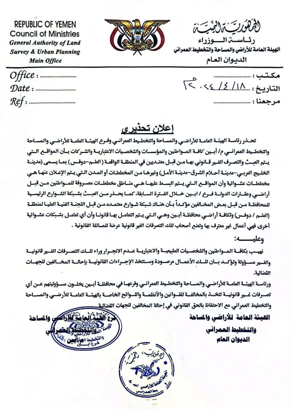 ورئاسة الهيئة العامة للأراضي والمساحة والتخطيط العمراني وفرعها في محافظة أبين يخلون مسؤوليتهم عن أي