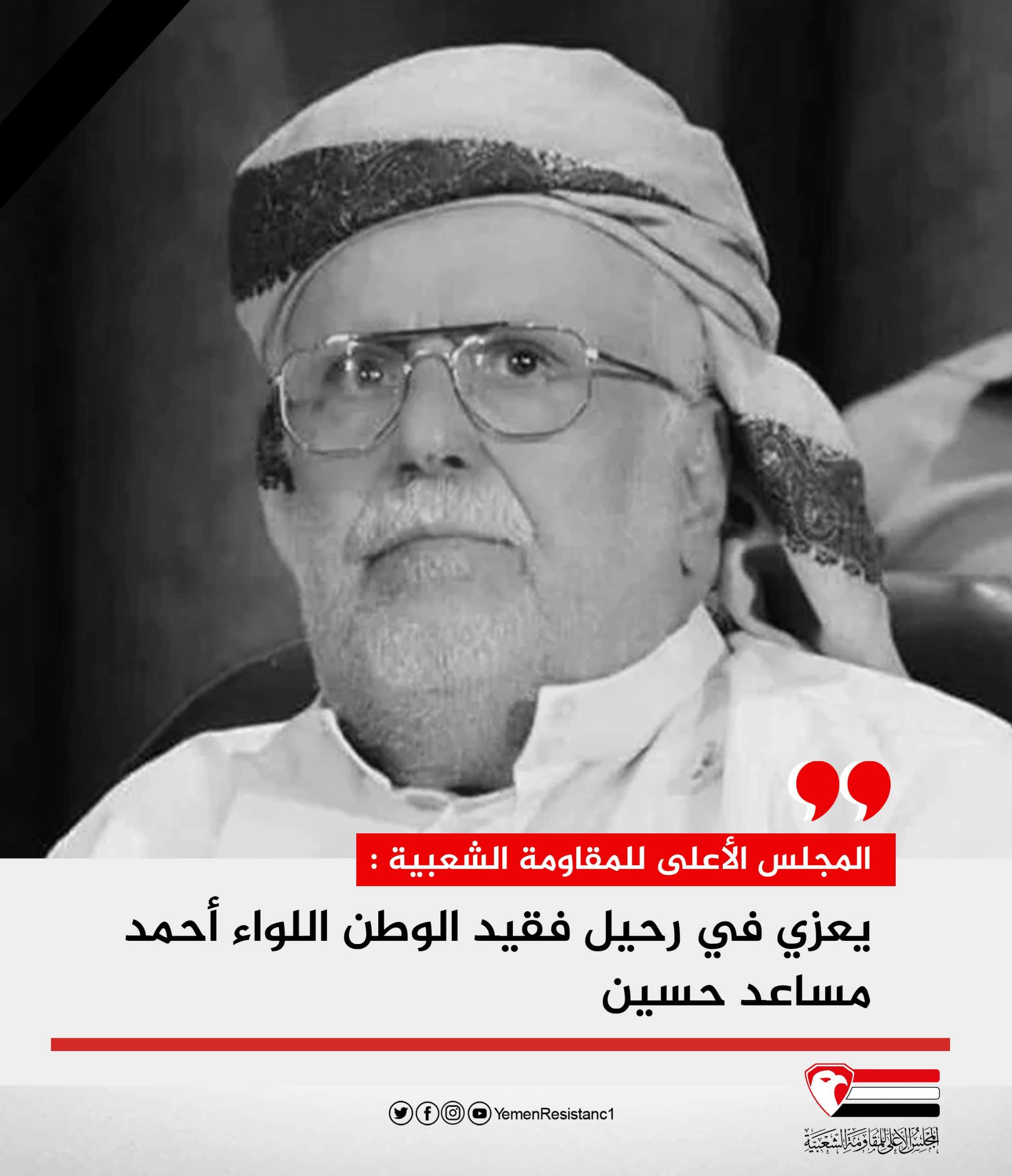 تقدم المجلس الأعلى للمقاومة الشعبية بخالص العزاء والمواساة في وفاة عضو مجلس الشورى، والمحافظ السابق ، ووزير شؤون المغتربين، والنقل الأسبق، اللواء أحمد مساعد حسين، إلى أهله وذويه ومحبيه.