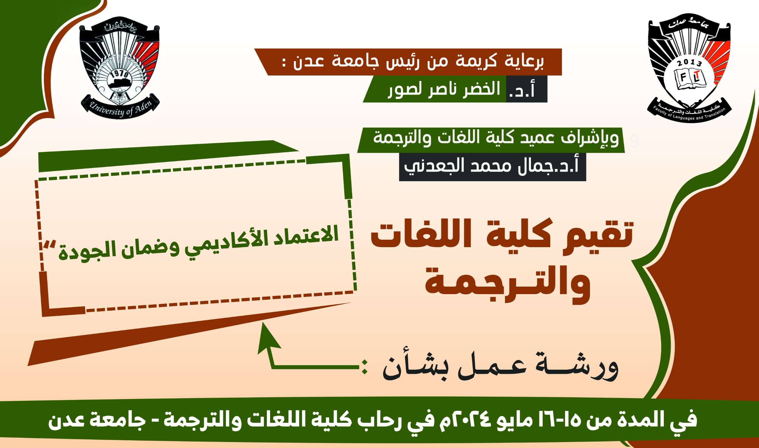 تجري كلية اللغات والترجمة بجامعة عدن ممثلةً بالأستاذ الدكتور جمال الجعدني استعدادت مكثفة لعقد ورشة علمية في الكلية حول (الاعتماد الأكاديمي وضمان الجودة) وذلك في خلال المدة ( 15-16 مايو 2024م).