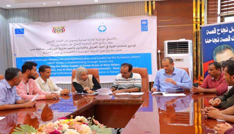 ووقع مدير عام مديرية خورمكسر عواس الزهري ، محضر تسليم المشروع إلى جانب المدير العام للمؤسسة المحلية للمياه والصرف الصحي عدن محمد باخبيره ، و ممثلي منظمة يمن ايد و الجهة المنفذة ، وياتي المشروع في إطار استمرار جهود مشروع تعزيز المرونة المؤسسية والاقتصادية سيري، الذي يتم تمويله بواسطة الإتحاد الأوروبي وينفذه برنامج الأمم المتحدة الإنمائي في اليمن عبر منظمة يمن ايد بإشراف وزارة الإدارة المحلية .