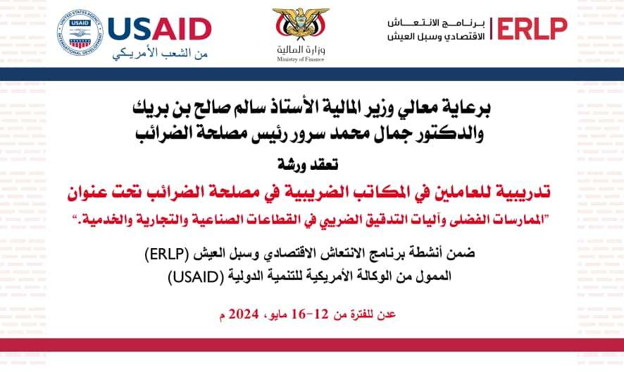 وستطرق الورشه إلى اهمية التدريب في المجالات الضريبة لتوريد الإيرادات ونقل المعرفة والخبرات العالميه إلىى الكار الضريبي المشاركين بالورشه والذي تقام بالشراكة مع برنامج الانتعاش الاقتصادي وسبل العيش (ERLP) الممول من الوكالة الامريكية الدولية (USAD)،
