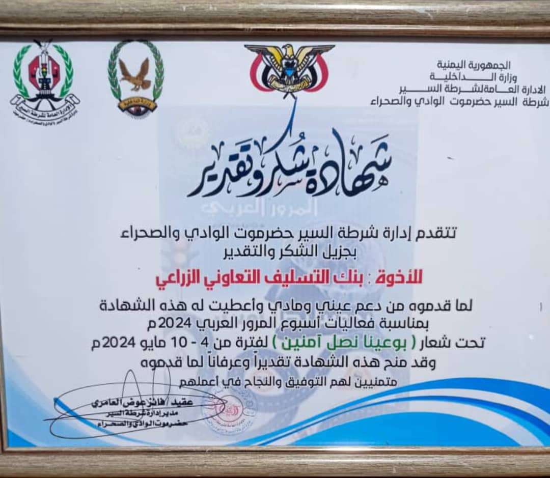 كرمت ادارة شرطة السير في حضرموت الوادي والصحراء ممثله بالعقيد فائز عوض العامري، مدير ادارة شرطة السير، بنك التسليف التعاوني والزراعي كاك بنك ومنحته شهادة شكر وتقدير لما قدمه من دعم مادي وعيني بمناسبة اسبوع المرور العربي 2024م، والذي اقيم تحت شعار (بوعينا نصل امنين) خلال الفترة 4 _ 10 من شهر مايو الجاري.