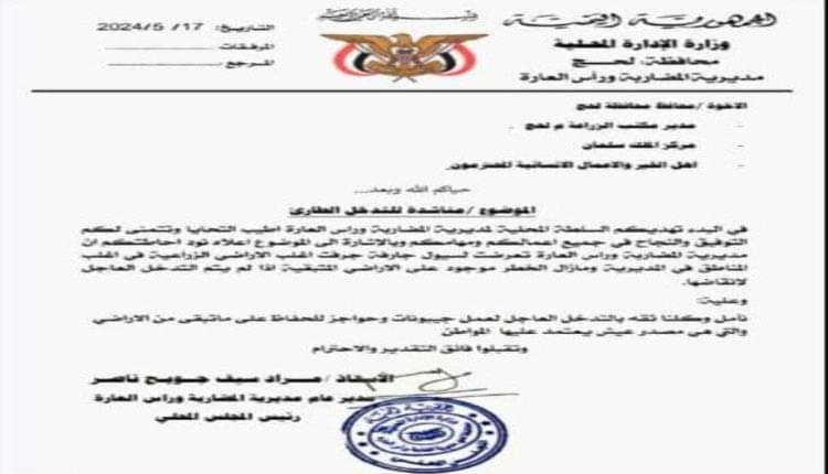 ونبه المدير العام بأن الخطر بات يحدق بجرف كافة الأراضي اذ لم يكن للسلطة المحلية بلحج تدخل عاجل لعمل جيبيونات وحواجز لحماية التربة من الانجراف.