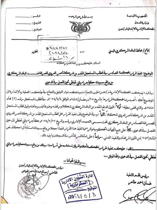 ووجه رئيس المحكمة الادارية الابتدائية بعدن القاضي صالح عبدالله أحمد العواص البنك المركزي بتنفيذ قرار المحكمة المقدم من شركة ناصر العروي ضد البنك المركزي من واقع مسودته كاجراء وقتي حتى يتم الفصل في الدعوى.