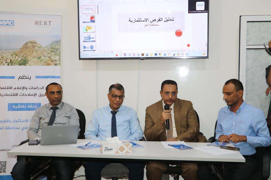الجلسة التي أقيمت في تعز وشارك فيها مسؤولين حكوميين ورجال أعمال وممثلين لمنظمات محلية ودولية وخبراء وأكاديميون اقتصاديون، عقدت لمناقشة نشرة تحليل بيئة الاستثمار والفرص الاستثمارية بمحافظة تعز التي أعدها المركز بالتعاون مع فريق الإصلاحات الاقتصادية.