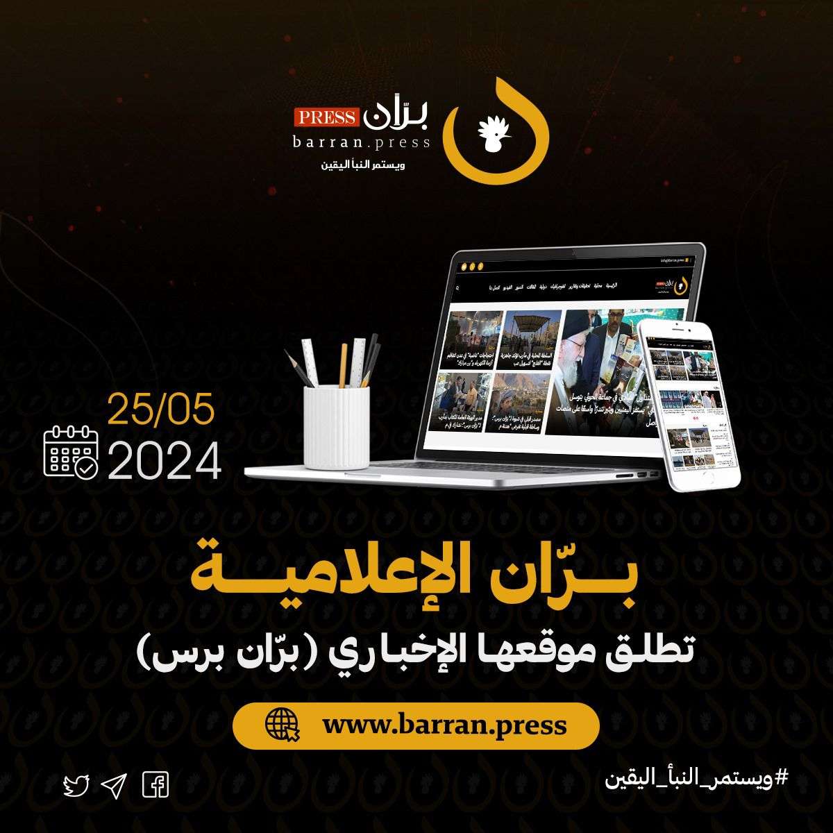 تعلن مؤسسة “برّان الإعلامية، اليوم السبت 25 مايو/أيار 2024، "رسميا" إطلاق موقعها الاخباري “برّان برس” (https://barran.press)، باللغتين العربية والإنجليزية، تحت شعار “ويستمر النبأ اليقين”.