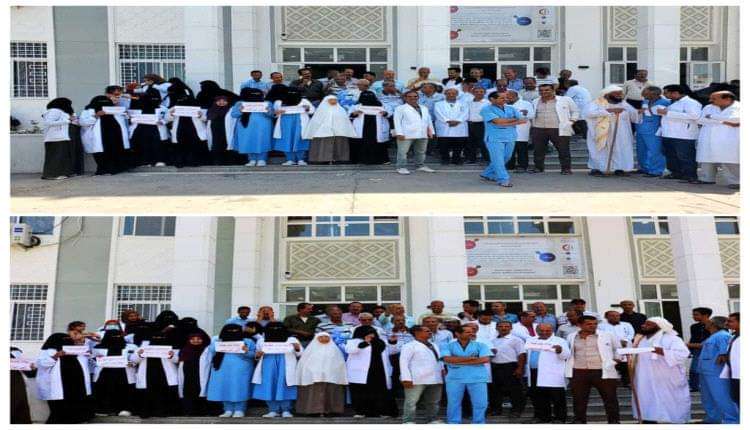وقفة احتجاجية لموظفي مستشفى الثورة للمطالبة بصرف مرتباتهم المتوقفة في تعز