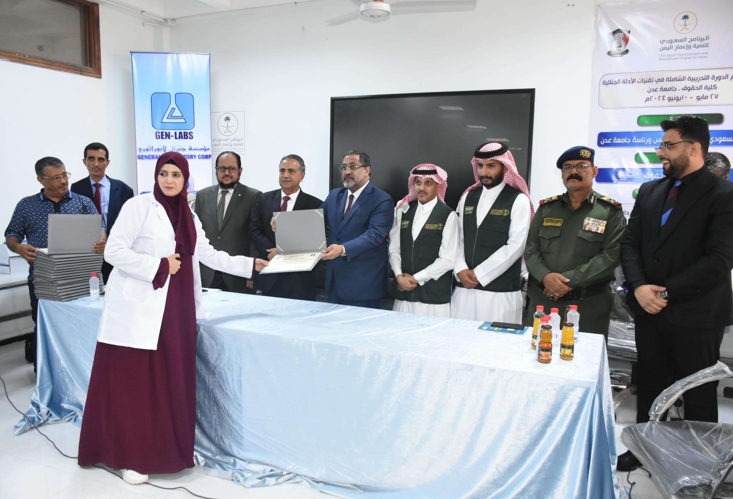 اختتمت اليوم أعمال الدورة التدريبية الشاملة في مجال تقنيات الأدلة الجنائية المقامة في كلية الحقوق بجامعة عدن، والتي دشنت في 27 مايو 2024، برعاية البرنامج السعودي لتنمية وإعمار اليمن وعمادة كلية الحقوق، والمنفذة من قبل الشركة الموردة لأجهزة المختبر الجنائي في الكلية ائتلاف مؤسسة جنرال لابوراتوري وتوكيلات الجردان الدولية، بحضور وزير العدل القاضي بدر العارضة، ورئيس جامعة عدن الأستاذ الدكتور الخضر لصور، ووكيل وزارة الداخلية لشؤون قطاع الأمن والشرطة اللواء محمد مساعد الأمير، ووكيل محافظة عدن عبدالرؤوف زين السقاف، وممثل البرنامج السعودي لإعمار وتنمية اليمن المهندس أحمد المدخلي، ورئيس مجلس إدارة مؤسسة جنرال لابوراتوري د. منير الحريبي.