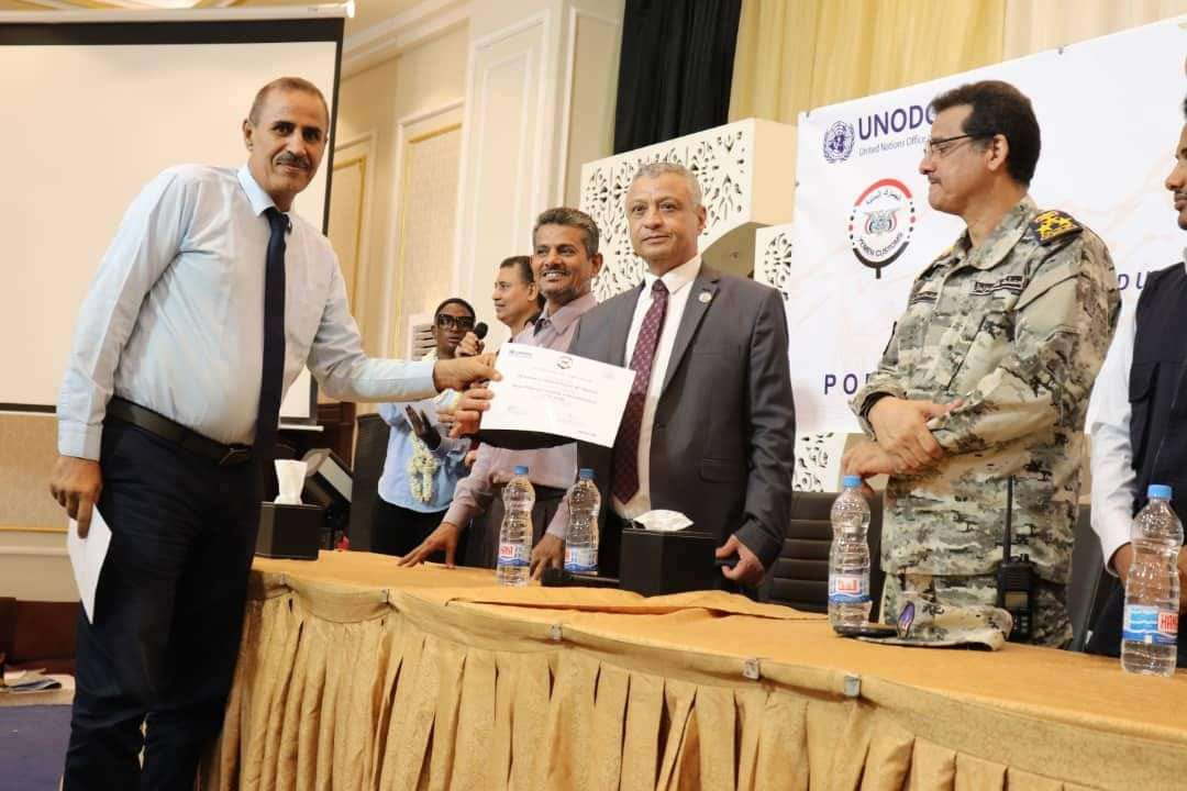 وفي ختام التدريب تم تسليم الشهادات للمشاركين بحضور الاستاذ صالح نهشل ضابط برنامج الأمن البحري و الأستاذ عبدالرب الخلاقي نائب الرئيس التنفيذي لمؤوسسة موانئ خليج عدن والعميد عبدالسلام اسكندر مدير عام مكتب رئيس مصلحة خفر السواحل وعبدالسلام العمري مدير أمن المنطقة الحرة وابوبكر الشارحي مدير العلاقات الدولية في مصلحة الجمارك.