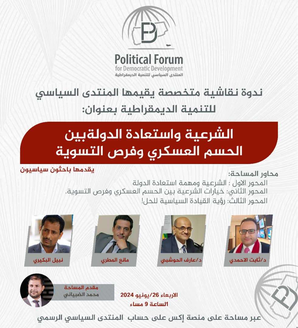 نظم المنتدى السياسي للتنمية الديمقراطية مساء الأربعاء ندوة سياسية شارك فيها المئات من السياسيين والحقوقيين اليمنيين، حيث خلصت الندوة إلى عدمية جدوى السلام مع مليشيا الحوثي الانقلابية، وأن تكلفة السلام أكثر بكثير من تكلفة الحسم العسكري.