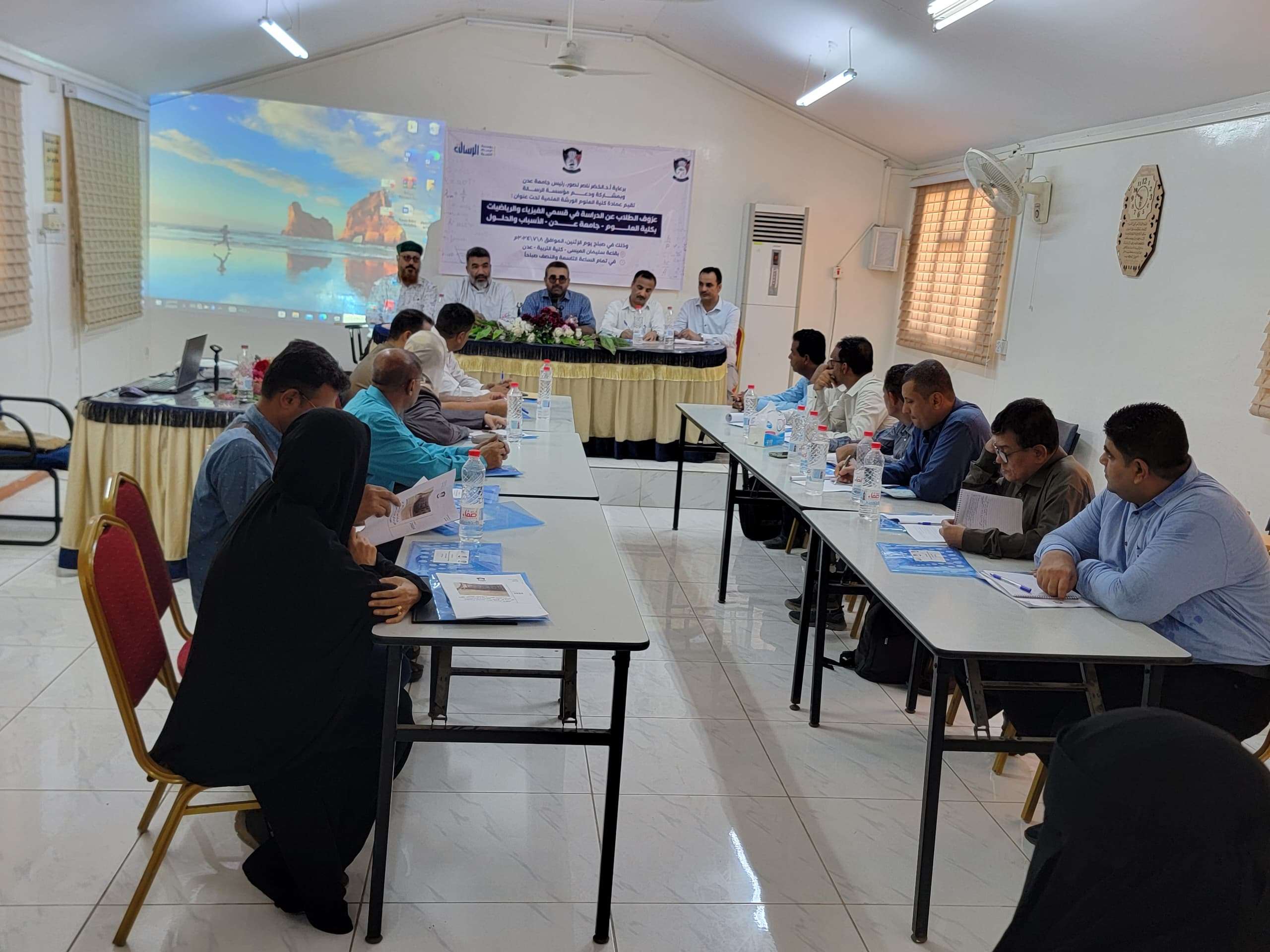 نظمت عمادة كلية العلوم بجامعة عدن، اليوم الاثنين، ورشة علمية بعنوان: "عزوف الطلاب عن الدراسة بقسمي الفيزياء والرياضيات بكلية العلوم - جامعة عدن.. الأسباب والحلول"، برعاية رئيس الجامعة أ. د. الخضر لصور، وبشراكة ودعم مؤسسة الرسالة للتنمية.