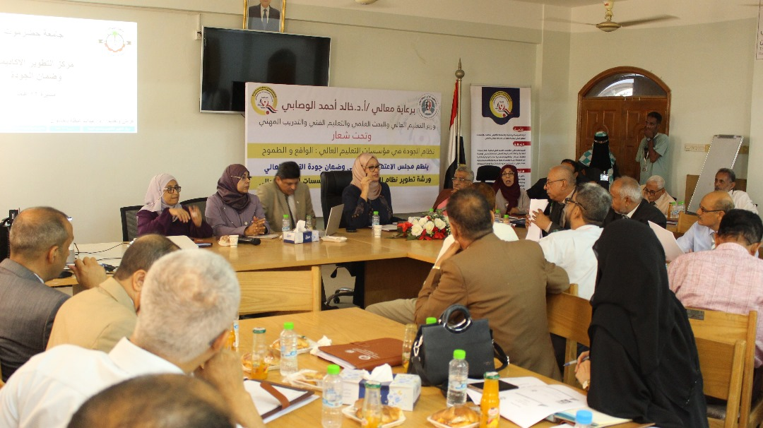 برعاية معالي أ.د خالد أحمد الوصابي وزير التعليم العالي والبحث العلمي والتعليم الفني والتدريب المهني، دشن مجلس الاعتماد الأكاديمي وضمان جودة التعليم العالي، اليوم الثلاثاء، ورشة عمل تطوير نظام الجودة الداخلي في مؤسسات التعليم العالي تحت شعار نظام الجودة في مؤسسات التعليم العالي: الواقع والطموح، بحضور عدد من رؤساء الجامعات الحكومية والأهلية.