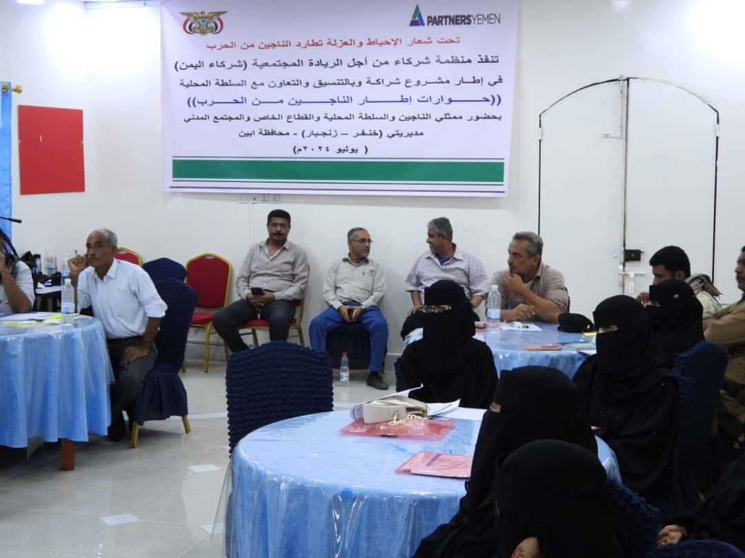 بحضور السيد مهدي الحامد الامين العام للمجلس المحلي بمحافظة ابين الأستاذ سليمان الوكود مدير عام مكتب محافظ محافظة أبين و يحيى اليزيدي مدير عام مكتب الشؤون الاجتماعية والعمل والدكتور ياسر باعزب مديرعام الاعلام وتحت شعار الإحباط والعزلة تطارد الناجين من الحرب نفذت منظمة شركاء من أجل الريادة المجتمعية في إطار مشروع شراكة وبالتعاون والتنسيق أولى جلسات حوارات اطار الناجين من الحرب بحضور ممثلي السلطة المحلية و الناجين والقطاع الخاص والمجتمع المدني