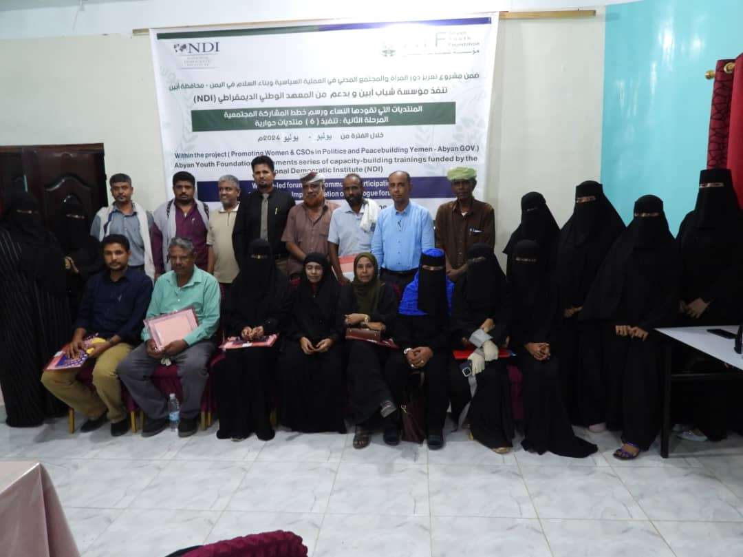 بحضور السيد مهدي الحامد الأمين العام للمجلس المحلي بمحافظة ابين نفذت مؤسسة شباب أبين بالتعاون مع تحالف نساء أبين بمقر المؤسسة في مدينة جعار بمديرية خنفر صباح اليوم الخميس المنتدى الحواري السادس ،والذي ضم ( 25) مشاركاً ومشاركة ضمن مشروع تعزيز دور المرأة والمجتمع المدني في العملية السياسية وبناء السلام في اليمن الممول من المعهد الديمقراطي الوطني ( NDI ) بنسختها السادسة بمشاركة (6) منتديات تقودها النساء في محافظة أبين تهدف إلى رسم خطط المشاركة المجتمعية.