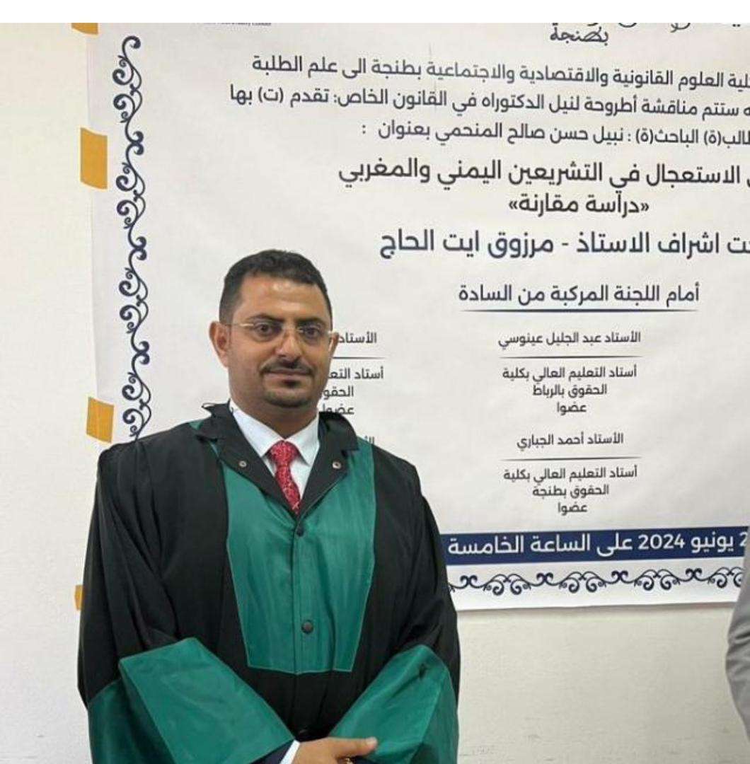 نال القاضي/ نبيل حسن صالح المنحميي درجة الدكتوراه في القانون الخاص وبميزة مشرف جدا -امتياز- مع التوصية بالطباعة والنشر من كلية العلوم القانونية والاقتصادية والاجتماعية بجامعة عبدالمالك السعدي بالمملكة المغربية - طنجة.