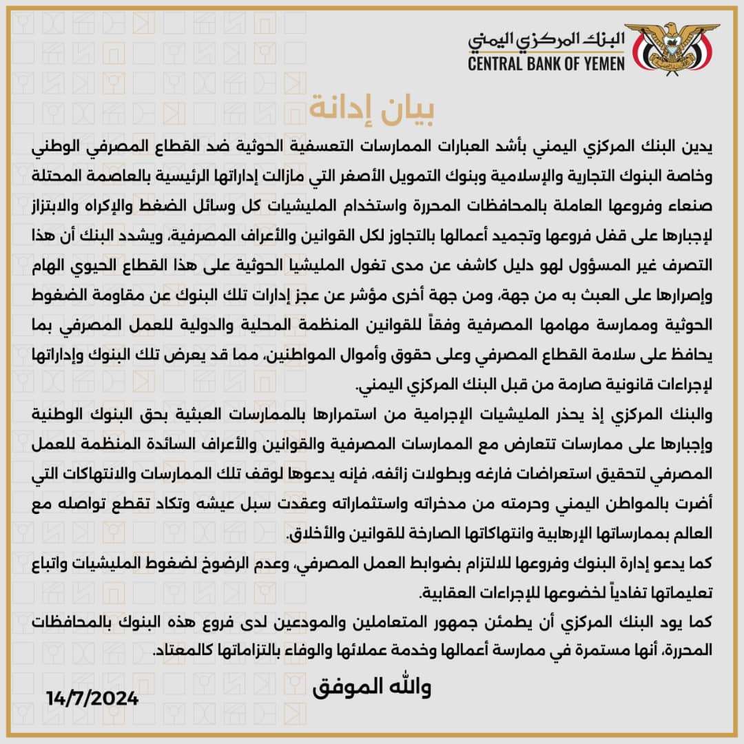 ادان البنك المركزي اليمني بأشد العبارات الممارسات التعسفية الحوثية ضد القطاع المصرفي الوطني وخاصة البنوك التجارية والإسلامية وبنوك التمويل الأصغر التي مازالت إداراتها الرئيسية بالعاصمة المحتلة صنعاء وفروعها العاملة بالمحافظات المحررة واستخدام المليشيات كل وسائل الضغط والإكراه والابتزاز لإجبارها على قفل فروعها وتجميد أعمالها بالتجاوز لكل القوانين والأعراف المصرفية، ويشدد البنك أن هذا التصرف غير المسؤول لهو دليل كاشف عن مدى تغول المليشيا الحوثية على هذا القطاع الحيوي الهام وإصرارها على العبث به من جهة، ومن جهة أخرى مؤشر عن عجز إدارات تلك البنوك عن مقاومة الضغوط الحوثية وممارسة مهامها المصرفية وفقاً للقوانين المنظمة المحلية والدولية للعمل المصرفي بما يحافظ على سلامة القطاع المصرفي وعلى حقوق وأموال المواطنين، مما قد يعرض تلك البنوك وإداراتها لإجراءات قانونية صارمة من قبل البنك المركزي اليمني.
